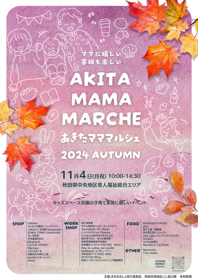 退任前最後のイベントを2024年11月4日(月曜日)㊗️秋田県中央地区老人福祉総合エリアにて!10時から14時半、開催します。☀️キッズスペースや授乳エリア完備、キッチンカー、ハンドメイド、運動教室まで🏀今回は人形劇の公演や来年起業予定のママを応援する会社プロデュースでママ向けのカメラ講座、ヨガ、ベビーマッサージも🧘♂️あります。