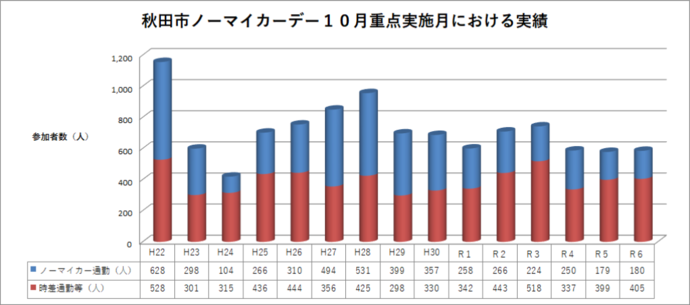 秋田市では、渋滞緩和や温室効果ガス削減などを目指し、自家用車に頼りすぎないライフスタイルへ転換するきっかけとして、毎月第4金曜日をノーマイカーデーに定めております。特に重点実施月である10月のノーマイカーデーでは、市内事業所の参加者数や実施に伴うCO2削減量などを公表することとしております。