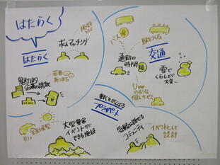 「はたらく」「くらす」「たのしむ」の3つのグループに分かれ、自己紹介のあと、グループワークを行いました。