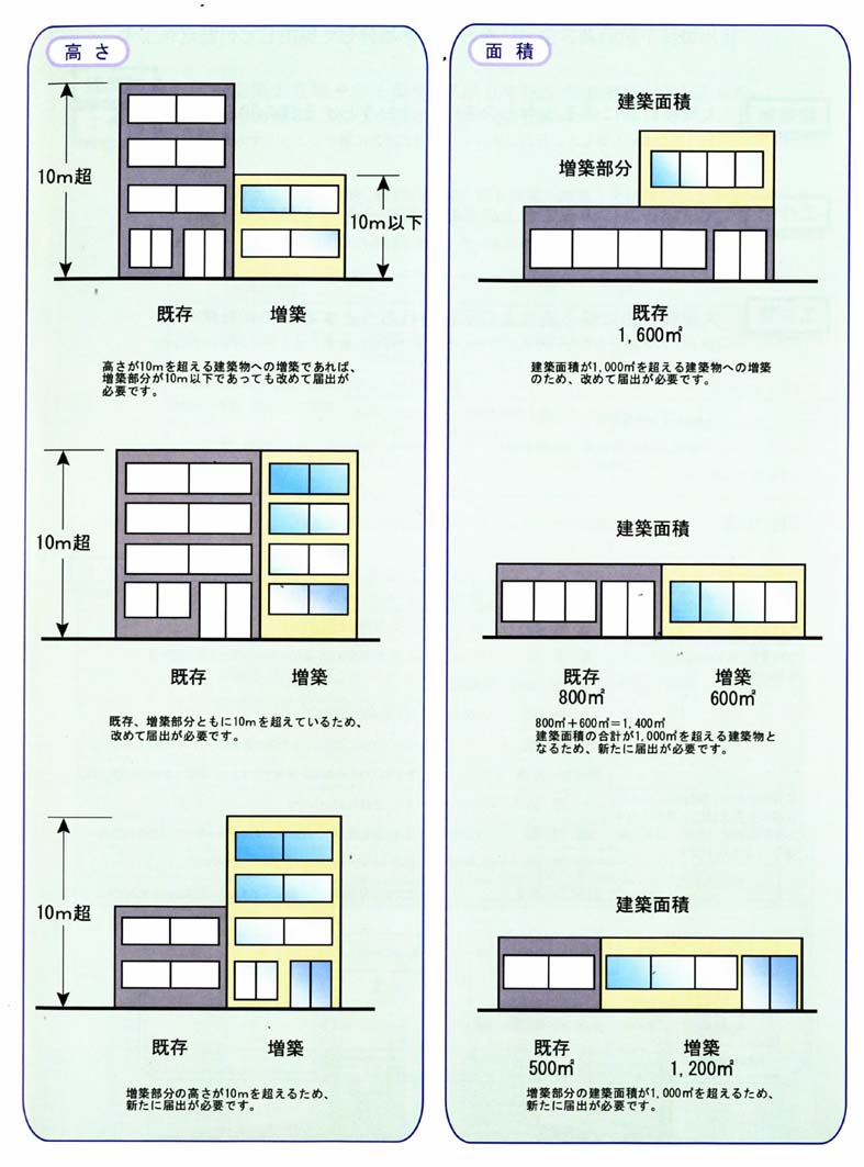 補足:「外壁の色彩の塗り替え」については、鉛直投影で一壁面の面積の過半を超える場合 - 増築または改築により建築面積が1,000平方メートルを超えることとなる場合を含む。