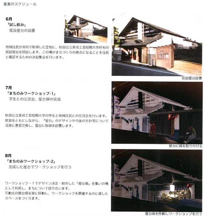 秋田市と大学コンソーシアムあきたが連携し実施した「平成17年度全国都市再生モデル調査」により、学官連携による景観形成のパイロット事業が提言されました。そこで平成18年度に、新屋表町通りを対象とし、「市民・産学官協働景観形成事業」を実施し、景観に関するワークショップ等を行いました。この取組みにより、参加した地元住民や美術工芸短大の気運が高まり、今回の応募に結びついたものです。
