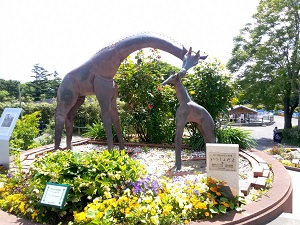 入園ゲートを入るとすぐにバラや草花で囲まれた2頭の母子キリンが寄り添うモニュメントが目に入る。多くの人が知る大森山動物園であった物語、「義足のキリンたいよう」を思い出す機会になっている。物語は20年前の出来事からつくられた。骨折した子キリンが義足を着けて約3カ月間、けんめいに生き、それを支えた園スタッフがいた。この事実を記憶に残そうとご婦人団体の浄財を基に子キリンと翌年亡くなった母キリン・モモの2頭を寄り添わせたモニュメントが造られた。命の尊さを改めて考える一つの材料にもなっている。