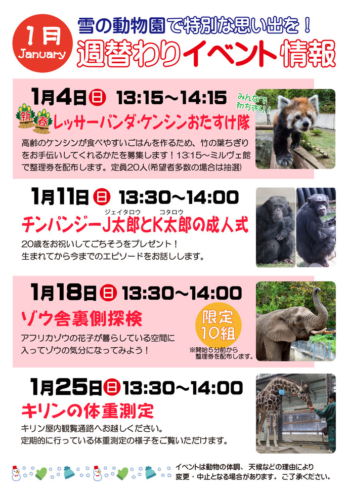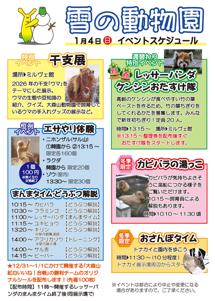 なお、天候や動物の体調などの都合により、イベントを中止する場合がありますのでご了承ください。